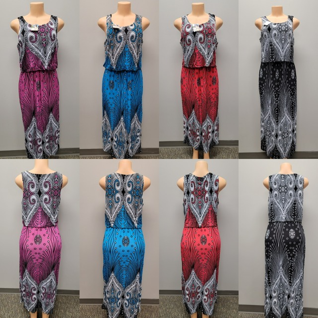 Different color dresses with large yellow sunflowers around it.