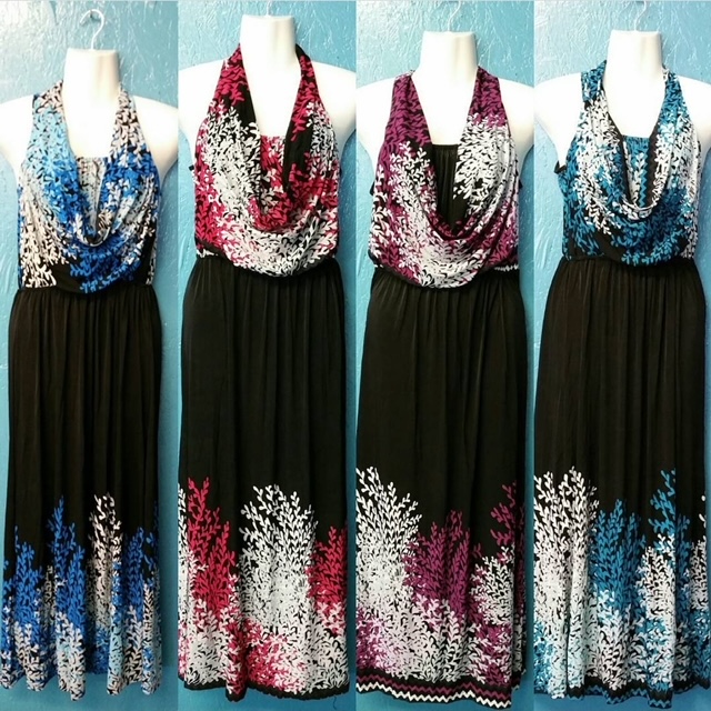 Black dresses wuth dufferent color floral prints on the bottom and torso areas.