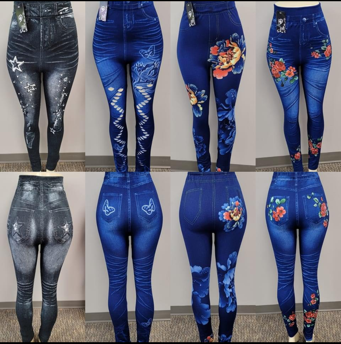 Leggings with a jean design on them. Features various jegging designs to choose from.