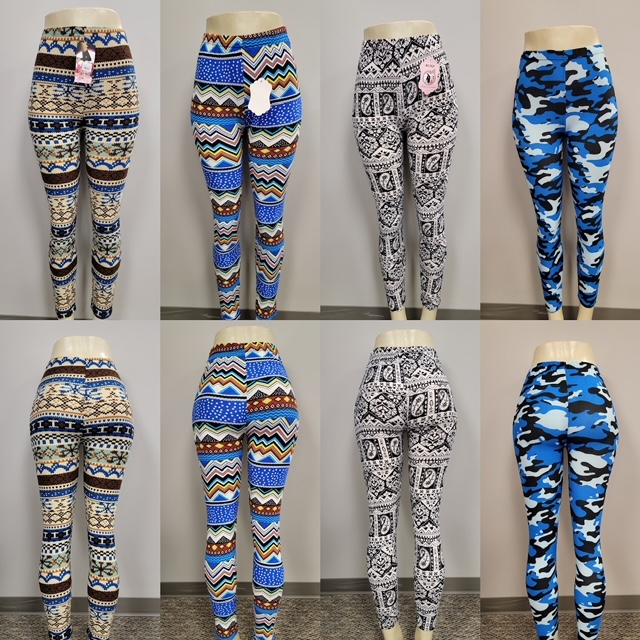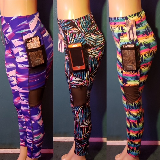 Leggings with different colorful prints and pockets. Good for active wear.