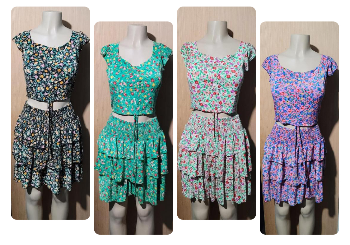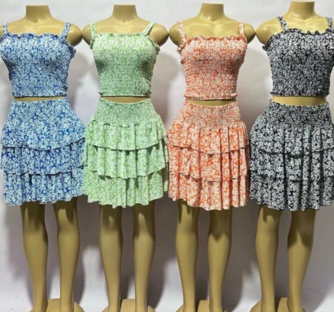 Two piece top and skirt set with a colorful design.