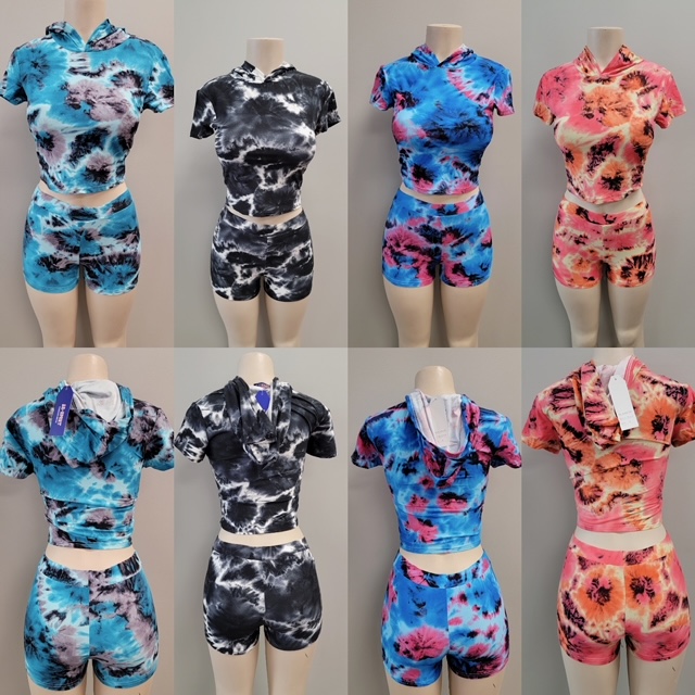Two piece top and shorts hoodie outfit with a tie dye design.