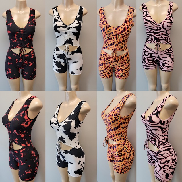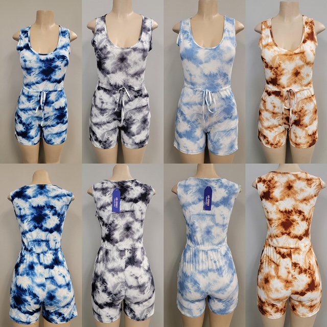 Rompers with various different tie dye designs.
