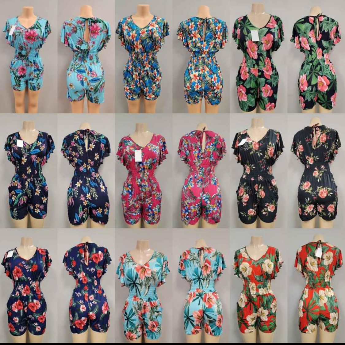 Romper with various different colors and flower designs.