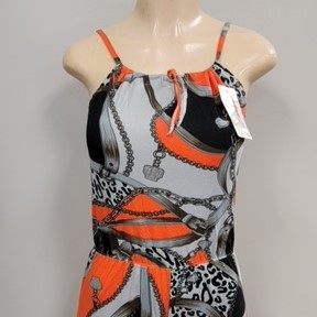 Romper with a unique orange and grey design pattern.